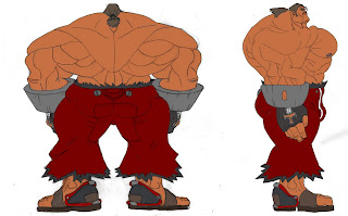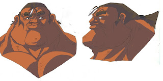 I shortened the three strands jutting up from his forhead considerably from what they were like in my senior film of last May but added the grey-streak in there to break up the colors of the face just a little bit. Also the Sumo-Wrestler inspired brush like pony tail contributes to the notion of the character as a super-powered martial artist, sumo-wrestleresque grappler.