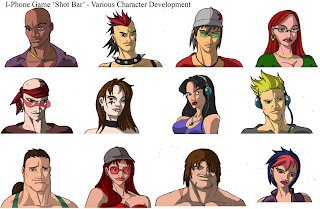 So I might go a month between posts or have the ability to do several back to back to back posts. Look at that! So now that Shot Bar is out I'm going to toss up some of these. These are a collection of some of the favorite head shots of mine that I did for the game. Basically for the game I did just about all of the art assets (bottles, labels, pour animation, expression changes on the characters.) As I noted before it had to be kept to real simple animation but in the end really super animation would have probably distracted from the potential pace of the game. All in all I had to do quite a few characters but they were all bust shots. Some of the above shots were first passes after which corrections had to be made. I learned quite abit on streamlining my own work flow through this project.